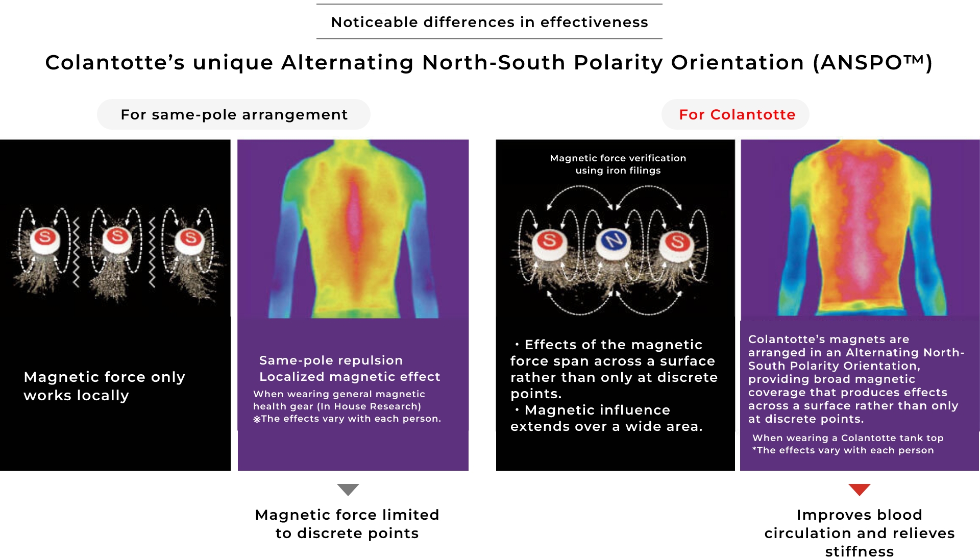 Colantotte’s unique Alternating North-South Polarity Orientation (ANSPO™) expands magnetic coverage and improves blood circulation.